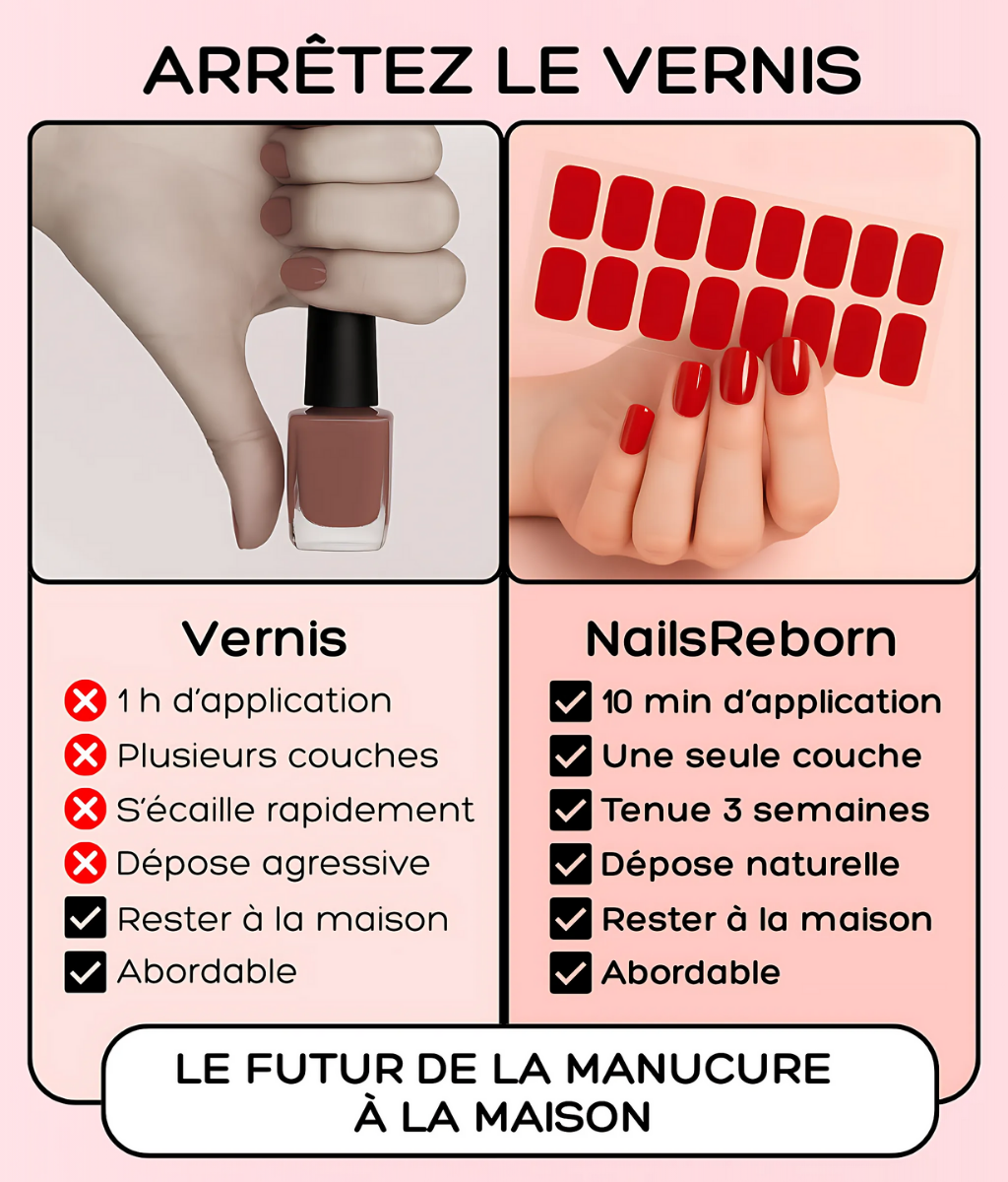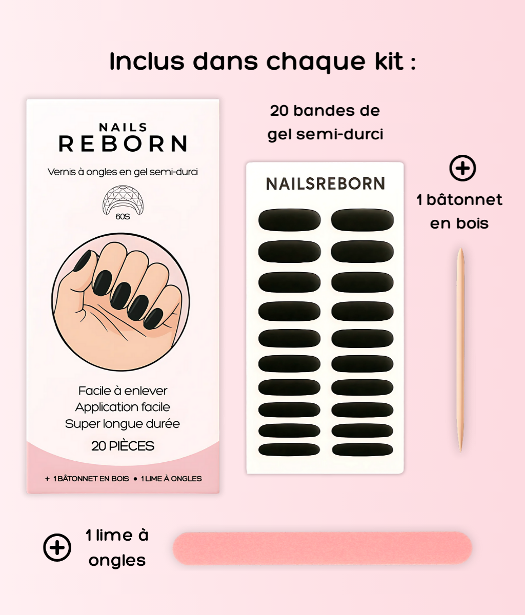 - Rapidité et simplicité : Contrairement à une pose en salon qui prend environ 1 heure ou un vernis classique qui nécessite plusieurs couches et un temps de séchage long, les bandes Nails Reborn s'appliquent facilement en seulement 10 minutes et sèchent sous lampe UV en 60 secondes.