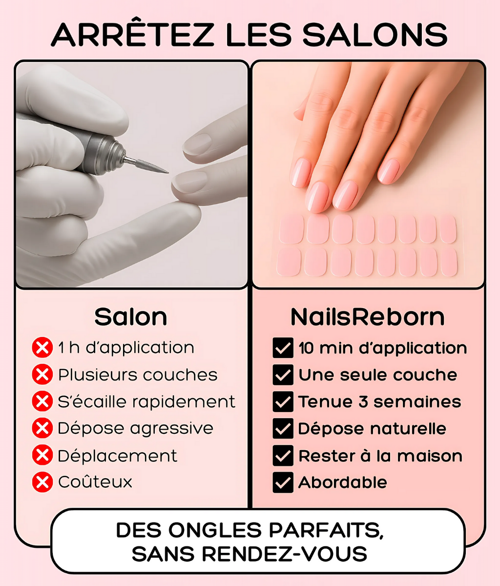 Quelle est la différence entre les bandes Nails Reborn, une pose classique en salon ou du vernis classique ?